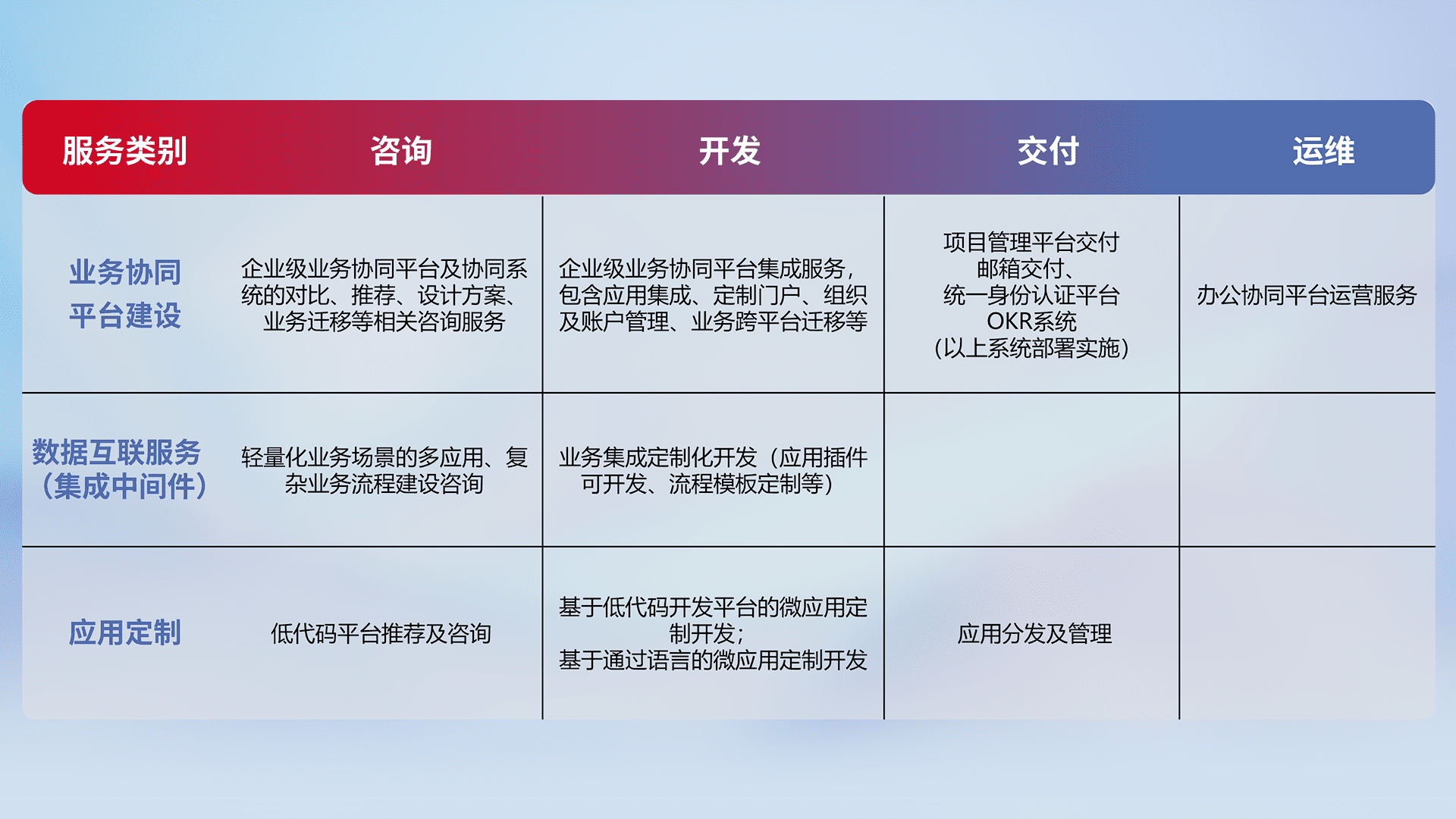 针对钉钉、、、企微、、、、IDaas等平台级产品提供产品的规划、、方案、、交付、、定制化开发等服务,,,,实现如统一协同办公、、、智能客户服务、、混合会议管理、、智能数据查询、、、、等业务场景,,,,实现数字化转型。。。